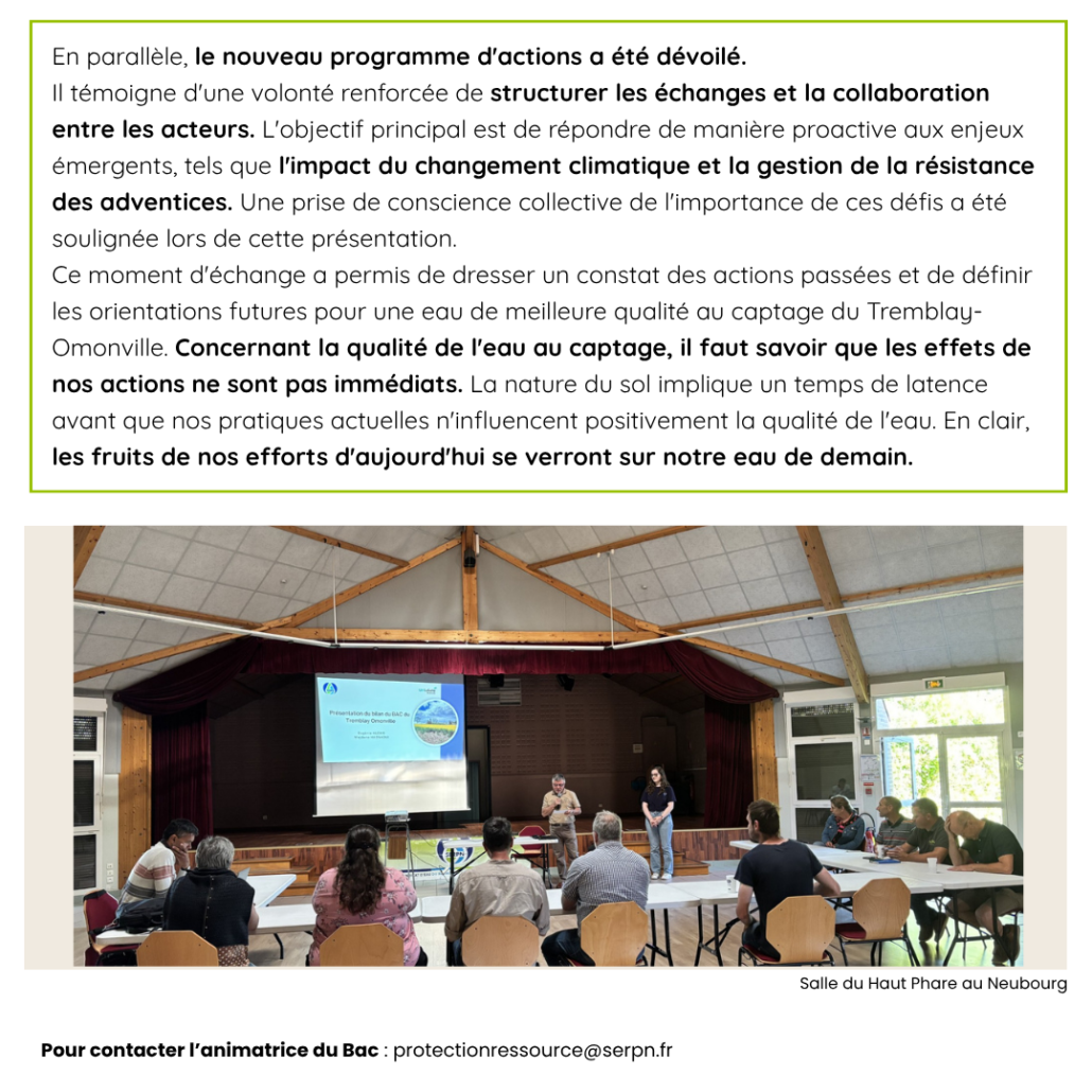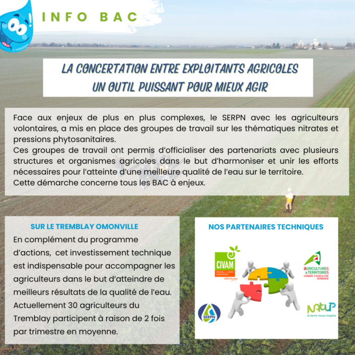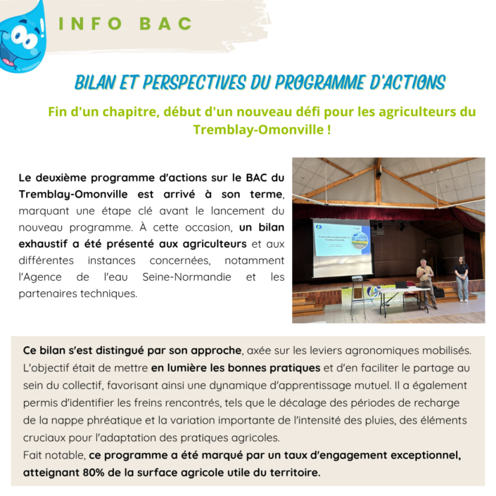 Une évaluation de l’efficacité des mesures en place sur le BAC du Tremblay Omonville a été réalisée en 2023 et a permis de construire le nouveau programme d’actions avec les agriculteurs et certaines organisations publiques agricoles.